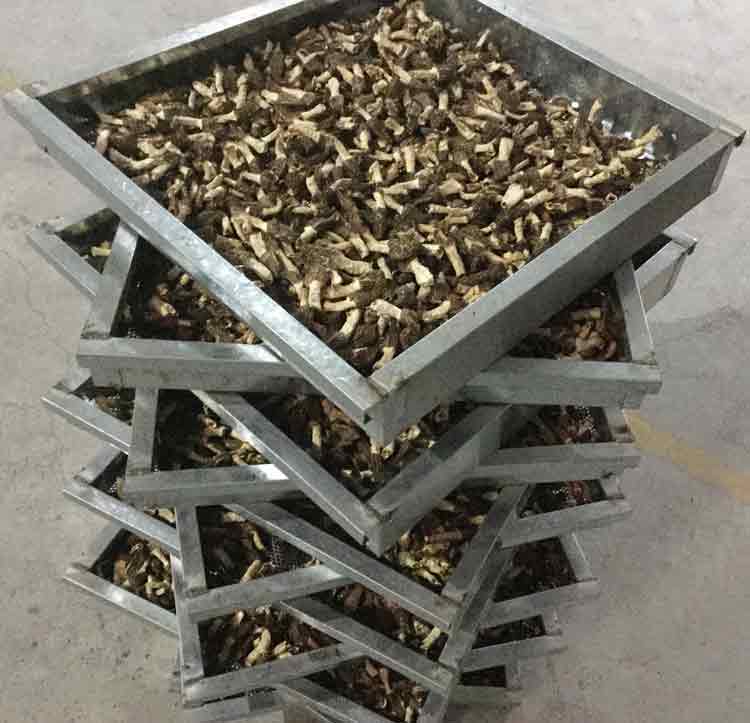 1、进行原料处理:将鲜羊肚菌剪柄。剪柄长短应根据羊肚菌形、羊肚菌肉、羊肚菌质、羊肚菌面来确定,并可分为去糠、剪半脚、剪平脚三个等级。一般而言,羊肚菌面小、羊肚菌肉薄、羊肚菌脚长的香 羊肚菌,以去糠为宜(保持全脚);羊肚菌面大而圆、羊肚菌肉薄、羊肚菌质松软的羊肚菌,可取其半脚(即剪去羊肚菌脚的一半),取值范围为1~1.5厘米左右;羊肚菌面大而圆,羊肚菌肉厚而 坚硬的,以取平脚为宜,即剪去脚,剩下0.5厘米左右。根据羊肚菌面大小、羊肚菌肉厚薄,羊肚菌面圆度、羊肚菌质好坏,分长短剪留羊肚菌脚,对成品羊肚菌干的价格和羊肚菌干的所得率影响很大。