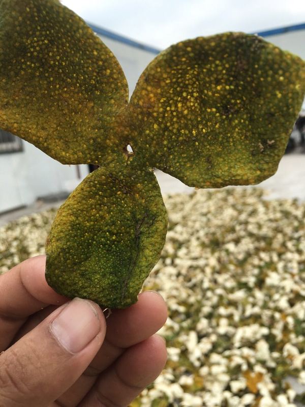 皮翻反整形。将果皮从陈皮烘干机内取出,将果皮翻反,注意不要将果皮折断,保持果皮完整,保持成品率。恒温烘干:将翻转过的陈皮均匀放置在自制网格车内,放入陈皮烘干机,将烘干机的工作温度设定在40-45摄氏度,恒温烘干至7小时,抽取样本称重,果皮质量接近新鲜果皮质量的25%,果皮含水量为15%左右为成品。在烘干过程中,注意陈皮烘干机烘干房内受热均均,一般每隔2-4小时左右调换一下网格车一次。调换原则为前后,上下对调,使之受热均均。